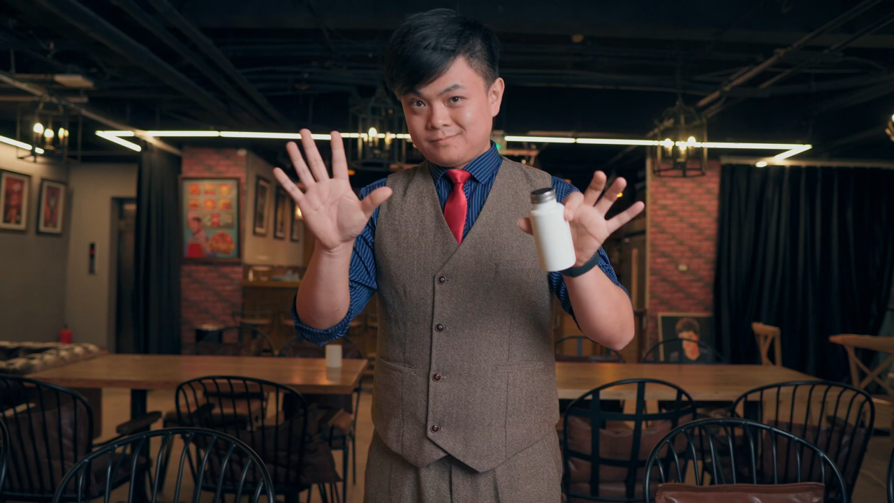 The magician takes out a salt shaker and sprinkles some "magic powder" on a toy egg, claiming that he has endowed the fake egg with "life." He then manipulates the fake egg, which hilariously emits a "sound."