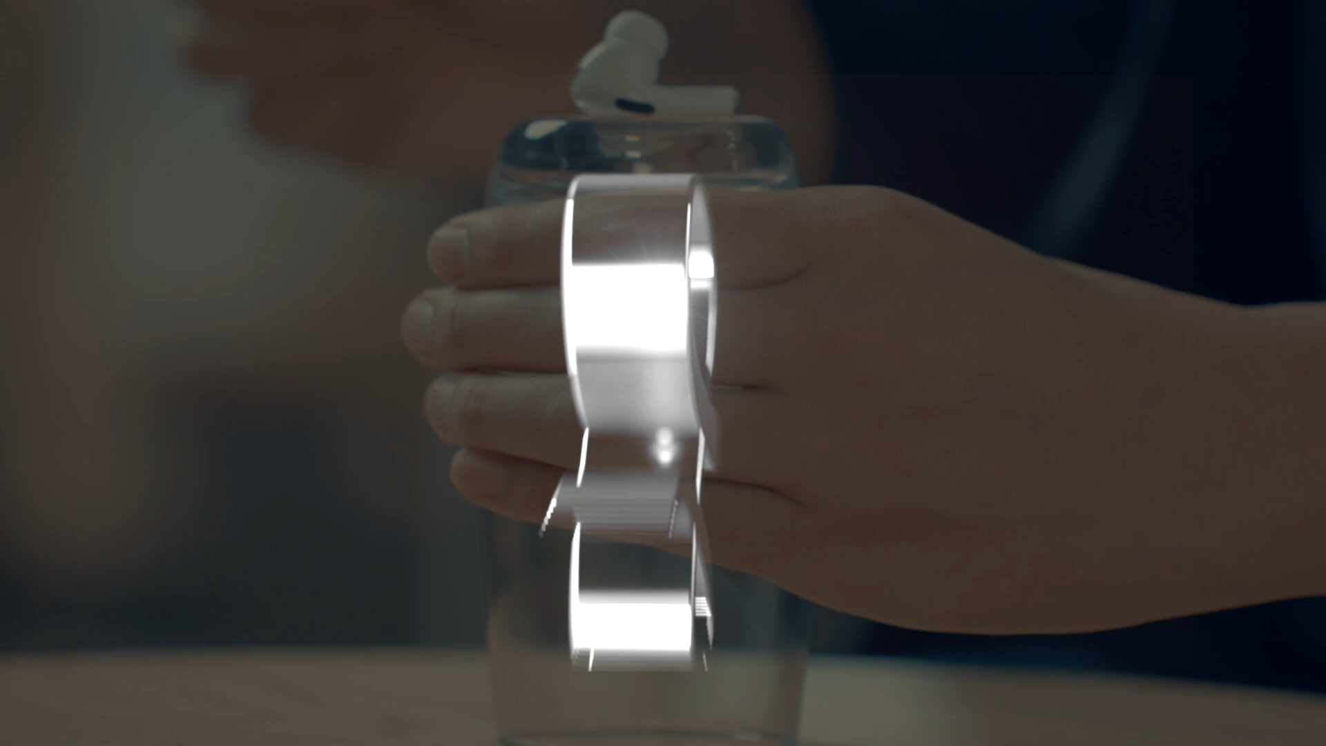 "Place the earbud at the bottom of a glass, wave your hand lightly, and the earbud instantly penetrates!"