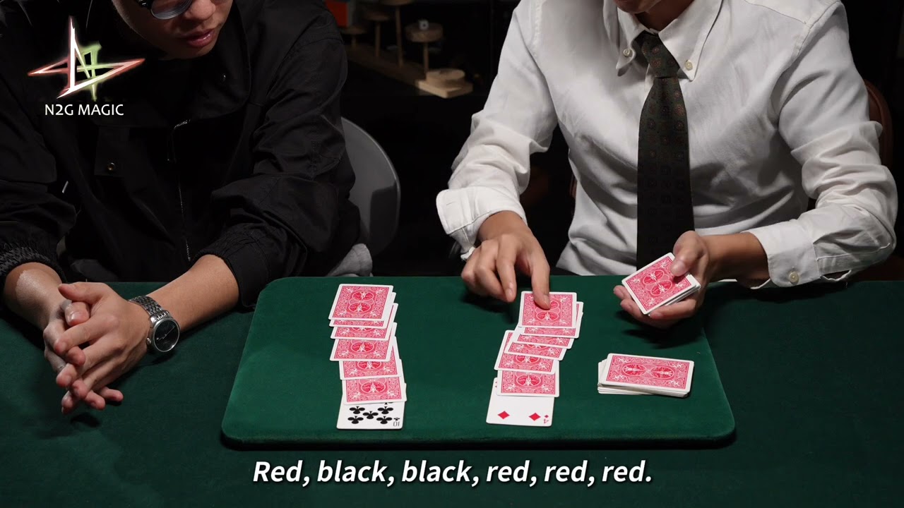 Magician takes out two indicator cards from a shuffled deck, one red and one black. Let the spectator guess what color the card is. If the spectator thinks the card is red, the card will be put below the red indicator card. If the spectator thinks the card is black, the card will be put below the black indicator card. In the end, all the cards below the red indicator card are red, all the cards below the black indicator card are black! The effect is just as described.