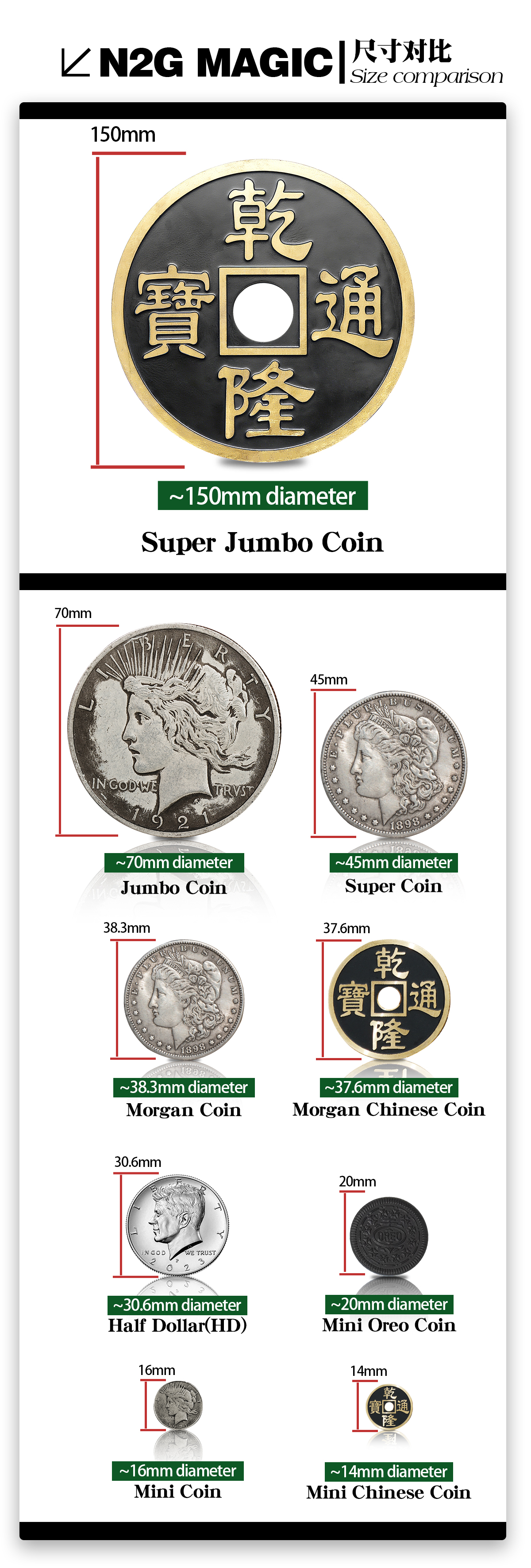 At N2G Magic, we're dedicated to helping you find the perfect props for your magical journey. We understand that precise dimensions are crucial when selecting coin props for your routines. To help you make informed choices, we've created this comprehensive guide to the various coin sizes available on our website, ensuring you know exactly what to expect from your next N2G Magic purchase.