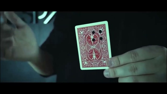 A regular playing card is prepared with four round holes at its corners (hole punch not included), resembling four coins.